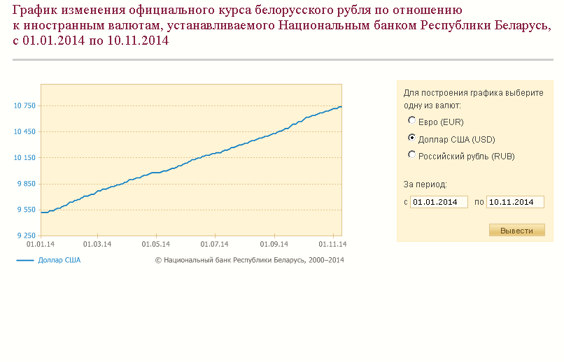 этот график — динамика белорусского рубля к доллару за 2014 год поскольку такого же графика тенге — доллар не удалось найти, то публикую график тенге-рубль