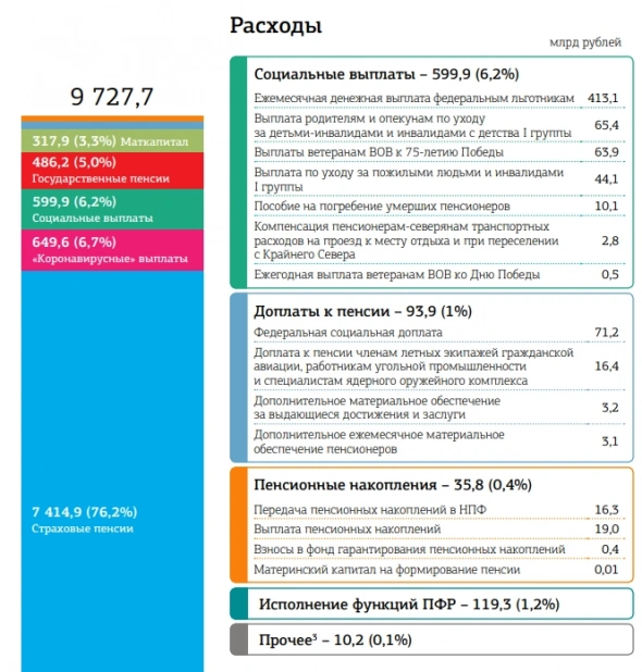 Общие расходы ПФ 9,73 трлн р. Выплаты пенсий и доплат 8 трлн р.(на страховые 7,41 трлн р, по государственному обеспечению и дополнительно 486,2 млрд р. (инвалидам, чернобыльцам, ветеранам и т.д., включая + доплаты старичкам до прожиточного минимума).
