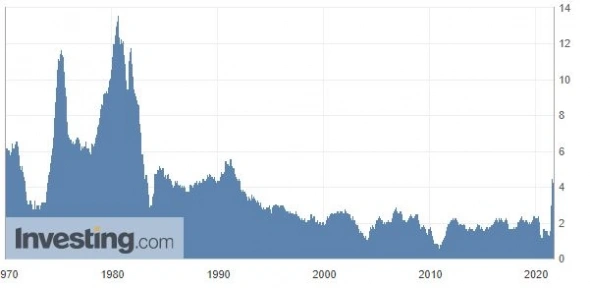 Некоторые эксперты говорят что сейчас в США инфляция как была в 80-х годах, однако ставку ФРС поднять не могут, так как это вызовет массовые банкротства. Причем инфляцию эту наверное считают по каким то новым формулам, так что на графике этого не видно. Якобы она сейчас достигает 15-20%