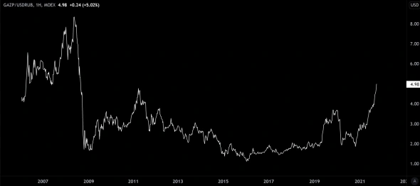 Газпром в долларах (без дивов) по сравнению с SP500 (без дивов) с мая 2008 по наст. время