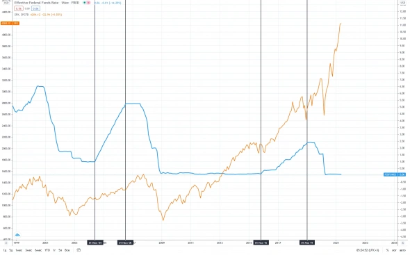 Итого — просто при росте инфляции падения акций не наблюдается, если нет ожидания повышения ставок (ФРС же до сих пор считает инфляцию временной). Акции будут падать не на новостях об инфляции, а на признаках того (или сигнале от ФРС), что она приобрела постоянный характер, и ФРС будет вынуждена повышать ставки.