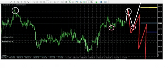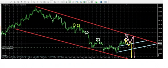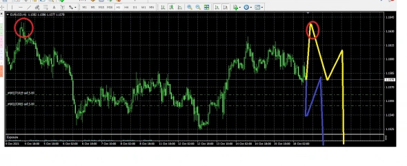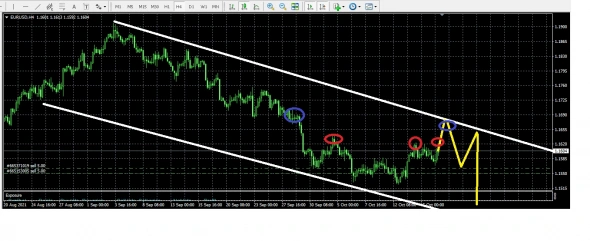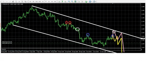 Привет! Именно. Вот, у меня видно, что я жду от рынка. Уверен, что американец не просто так вырыл надежный белый канал и не пропустит европейца вверх. Продал два раза по 5 лотов. И это видно. Больше похоже на то, что цена пойдет вниз по желтому сценарию. Но, надо мириться и с тем, что мишка позволяет волу пойти и по розовой дороге через серые вершины 1.1675. Мой стоп выше красных 1.1756.