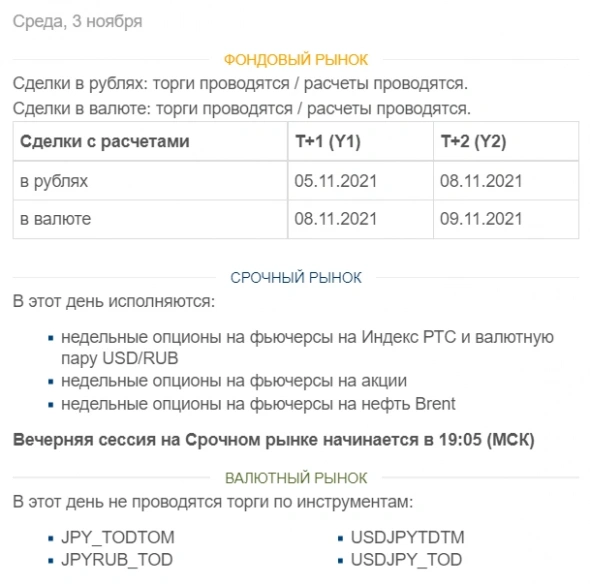 а iss при этом говорит, что 04.11.2021 — торговый день как для срочки, так и для фондовой секции: