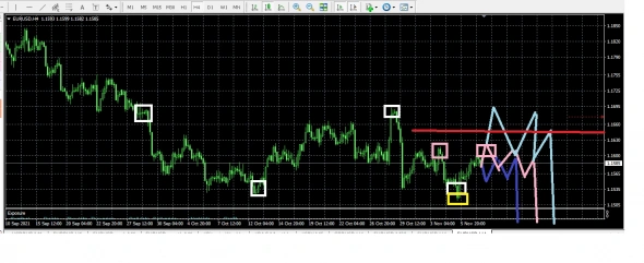 Все завязано на торговой системе трейдера. Я вообще не вижу никогда трендов на рынке. Для меня весь график- это флэты, которые существуют, ломаются или строятся. На этой картинке видно, что сломали белый флэт 1.169-1.1524, а теперь будем строить красный канал, чтобы и его сломать. Посмотрим, какой вол на нас нападет, розовый или синий. Он любит ходить зигзагами.