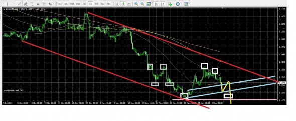 У нас два рабочих варианта. Первый связан с тем, что белый канал- это серьезное препятствие для европейца и он не сможет пройти выше него, но сможет выпрыгнуть к 1.1389, чтобы там начать борьбу, а потом отступить для формирования большого розового канала. А второй вариант похож на первый во всем, кроме того, что все будет оформлено через небольшой рост и синее движение вниз. Меня оба варианта устраивают.