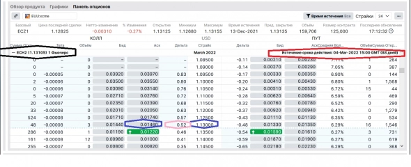 Есть одна из самая прекрасная стратегия, которая доступна абсолютному большинству. Это дельтахедж. Именно сейчас ее использует кукловод. И для ее созданы сейчас все условия. Суть проста- собираем руками микро прибыль с колебаний в любую сторону и имеем легкие 5% в месяц закрытыми глазами. Все, что нужно- это на первом рисунке выбрать красный квартальный срок. В нашем случае- 88 дней. Посмотреть на черную цену, чтобы понять, что покупать. Берем синий колл 1.13 по 146 пунктов. Это 1825 в долларах. Розовую дельту умножаем на 125000 и так вычисляем сумму хеджа. Это продажа 65000 евро. Все, каждые 5 минут уравниваем дельту. Грамотный форексник должен угадать синее движение. А мы можем заработать на всех, даже на белом варианте с 1.156.