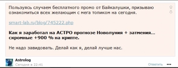 Я таких, как Байкал и ему подобных, ставил на место за все 32 годы моей астро практики. Им кажется, что астрология — это обман, так как дальше своего носа ничего не видят. Недоразвитость оккультная… это бывает.