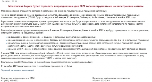7 января, 23 февраля, 8 марта, 9 мая, 4 ноября 2022 г. — в дни официальных государственных праздников — торги будут проводиться только инструментами, имеющими аналоги на зарубежных рынках:
