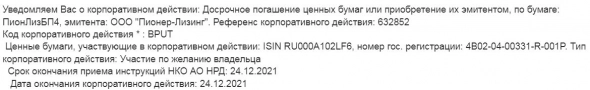 17 декабря 2021 года осуществлен выкуп ценных бумаг в рамках очередной ежеквартальной оферты по 4-му выпуску биржевых облигаций ООО «Пионер-Лизинг» (ISIN RU000A102LF6).
