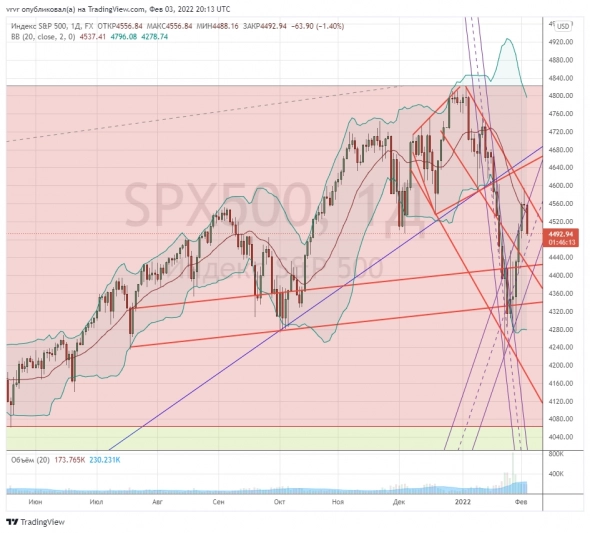 Здесь жду уровень 4450. От него Лонг до 4600 примерно. Гэп надо закрыть.