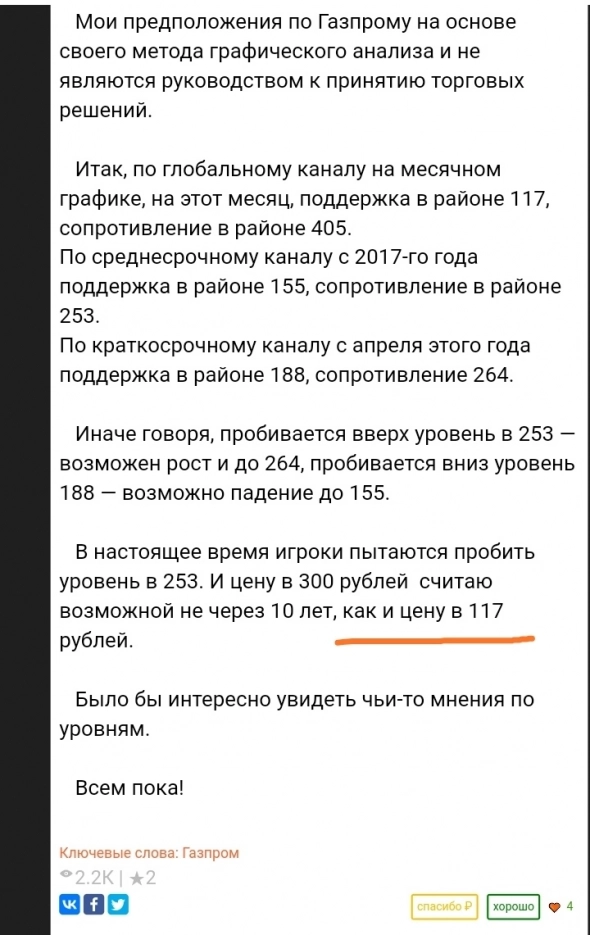 Не так давно делал «прогноз» по Газпрому. Пока немного «не угадал» с минимумом. Найду позже свой тот «прогноз», может, добавлю изображение. Если не ошибаюсь, то по 117 рублей «прогнозировал» Газпром не так давно. А про максимум говорил в районе 405 и тоже - немного не дотянула цена до этой цифры. А была цена Газпрома в момент моего «прогноза»… Найду и укажу тоже позже, но это так — про свой «прогноз» просто для интереса о том, как сбываются или не сбываются различные прогнозы, и о том, когда это происходит.