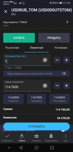 На 110р сработала условная заявка, висевшая со вчера 2 лота долларов.