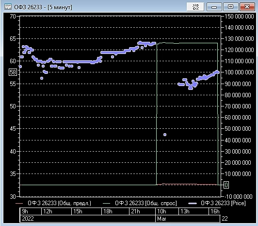Доказательство «эффективности» поддержки цен ОФЗ. ОФЗ 26233 упала больше всего на аукционе открытия -32% с 64 до 43.73. По минимальной цене прошло сделок на 209 млн руб. Банк России стоял где-то между минимально возможной ценой 21 марта 41 и 41.5. В стакане после аукциона открытия заявки на 120+ млн облигаций так и не было видно. Общий спрос с 10:05 до 16:50, то есть в течение дня без 10 минут, был от 125 до 127 млн шт. в стакане. На аукционе кто-то явно ошибся и продал большой объем по низкой цене. Затем ОФЗ открылась уже по 55 и выросла за день до 57.5 (-10% к цене закрытия 25 февраля)