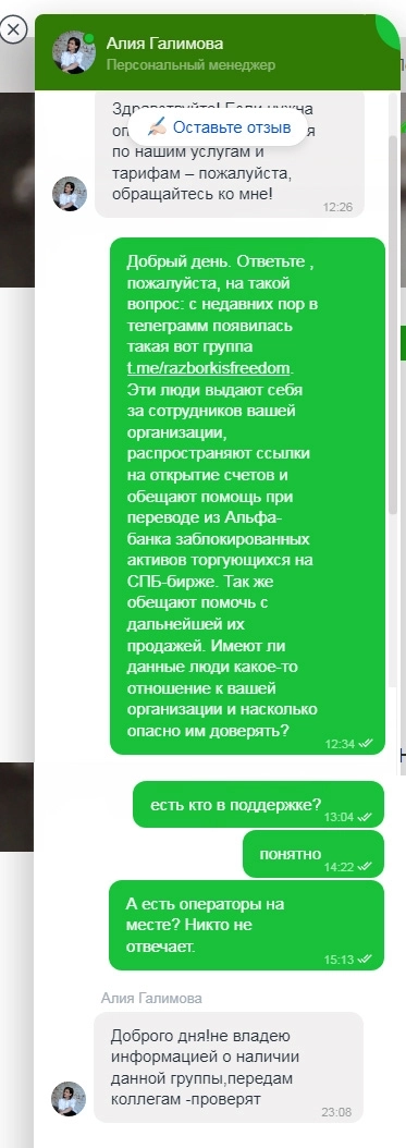 Сегодня открылся счет во Фридом (пришла СМС и уведомления на почту). Затем позвонил некий Карен, представился менеджером Фридом Финанс. Спросил, состою ли я в закрытом телеграмм-чате. Я ответила, что нет. После чего, он сказал, что тогда работать со мной не смогут, так как всю информацию готовы придоставить только там. Обещал разблокировать все с СПБ-биржи, но только при условии, что я в «закрытом чате».