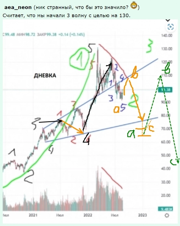 Кислотно-красный сценарий с падением цены до 6 долларов маловероятен. То же держу его в кармане, по ходу пьесы сумеем переориентироваться я думаю. Маловероятен, потому что старые прогнозы про нефть по 240 еще не осуществлены, импульс откорректирован вроде нормально.