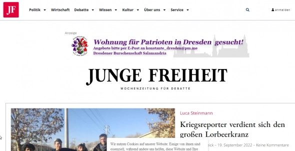«Junge Freiheit ( JF ) — национальная немецкая еженедельная газета . Он считает себя независимым, консервативным средством массовой информации. Политологи относят их к пограничной зоне между консерватизмом и правым экстремизмом и называют их рупором Новых правых ..»