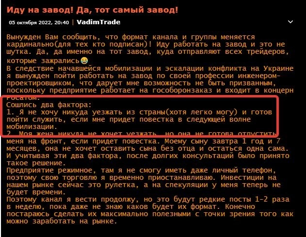 Конечно нашлись самородки, которые меня теперь считают трусом, человека который принял решение кратно сократить свои доходы, избавиться от комфорта и свободного времени, вместо того чтобы уехать в тот же Казахстан, где есть знакомые, ведь объективно меня ничего не держит в городе и стране! На завод иду только ради жены и сына и не смотря на это в любой момент готов встать в строй, если тех усилий, что сейчас предприняли, нашим войскам не хватит. Встану не смотря на артроз колена, язву желудка и гипертонию(да, да, я в свои 30 с небольшим сижу на таблетках, чтобы к вечеру не мучаться от 160/90), ну а вы те, кто злобствует в комментариях сами то почему еще не на фронте? Откуда у вас время ехидничать в комментариях, нужно уже быть на призывном пункте или сами уже на заводе? Может быть даже не дай Боже за границей😲?