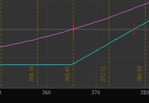 Вот картинка. Розовая линия это график на сегодня и он почти линейный что примерно соответствует графику базового актива. А свойства опциона, когда станет фиксированный убыток и неограниченная прибыль проявится со временем (голубая линия), и в данном случае полностью окончательно оформится через месяц.