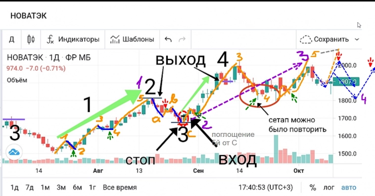 3. Начался новый ростовой импульс. В примере импульс начался в районе локального уровня (3 слева), это ещё облегчает задачу. Выполнили вход, в идеале выше предыдущего открытия (не критично). Стоп ниже минимума или в уме.