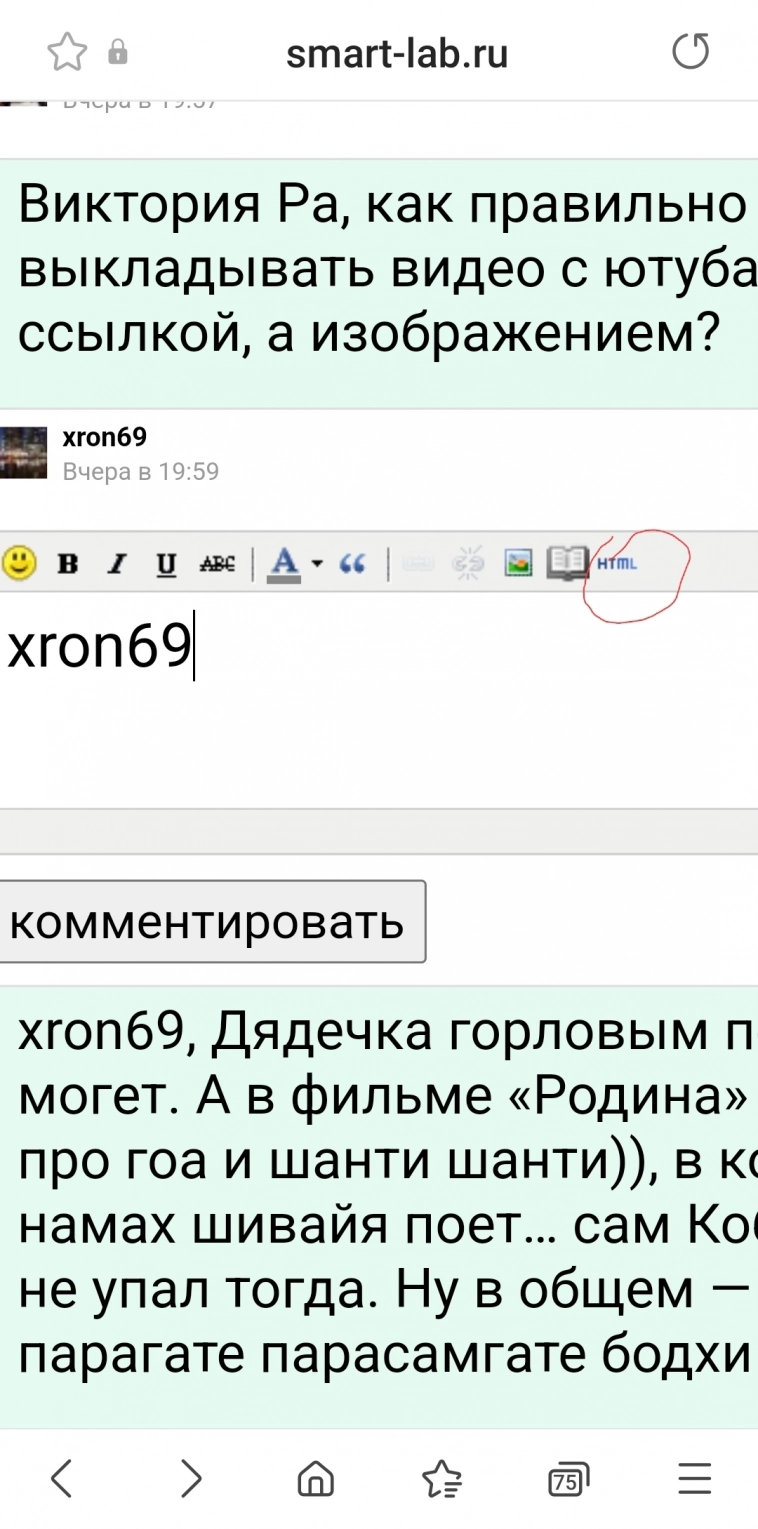 и вставляем скопированную ссылку, но… она с первого раза не идёт в «правильном» виде, тогда «редактировать», стираем вот то что «YouTube… и т.д» и вновь HTML, вставить, обновить и комментировать. Всё пойдёт, но со второго раза, так у всех.