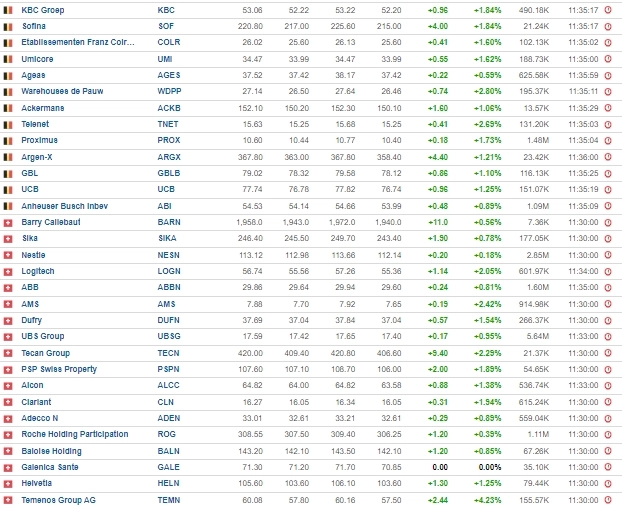И Брюссель и Цюрих вчера показали отличную динамику во время сессии (которая в скором времени вряд ли повторится) и основые акции на этих биржах закрылись в абсолюютно зелёном фоне:
