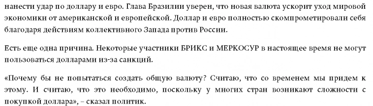 lotus123, Без обид, но как раз посмотрел и кроме громких слов причем именно в пересказе расиянцев ни слова, ни единой прямой цитаты хоть Лулу, хоть бубу нет. Даже вот якобы ссылка www.silkroadbriefing.com/news/2022/10/04/brics-working-to-develop-a-new-reserve-currency/, а на деле в тексте "«Обсуждается возможность и перспективы создания единой валюты на основе корзины валют стран БРИКС», — сказал Князев". Соответственно очень похоже что единственной страной БРИКС обсуждающей «создание» валюты есть россия. Тем более, что даже в российской прессе сильно не шифруются, и в качестве причин четко печатают методичку: