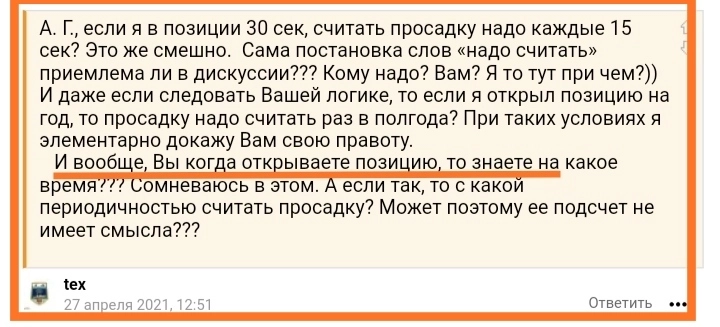 Я сам давно пытался с ним дискутировать насчëт риска и для себя понял, что он допускает значительные просадки. Считаю, что это его личное дело и право, и вполне возможно, что он как-то прав по-своему. Я пока придерживаюсь совсем других взглядов на риск и предполагаю, что такие просадки, которые он допускает, абсолютно недопустимы и могут, в конце концов, привести к краху депозита. И, конечно, никоим образом не желаю ему подобного, и могу тоже ошибаться в своих предположениях насчëт его действий. Как-то так.