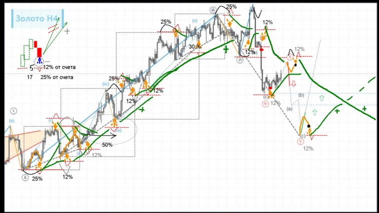Судя по тому, что после прошедших трёх волн вниз (волна W) мы так и не увидели пятую — коррекция по золоту вероятней всего разовьётся не в виде зигзага, а в виде двойного зигзага.