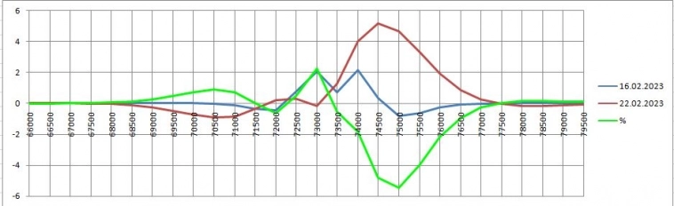 Синяя линия — отклонения цен опционов (в %) со сроком исполнения 16.02