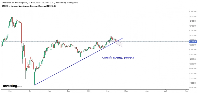 14.02.2023. Вчера индекс ММВБ закрыл день «волчком» — в нашем случае это фигура размышления. Индекс снова оттестил снизу верхнее локальное сопротивление (на утро 2255 и 2273), откуда отбился и поехал вниз, на вечерке почти доехав до нижнего. Здесь, судя по всему, продолжается коррекция в рамках 2 в 3 в 3, сигналом к окончанию которой будет пробой с ретестом 2273 и обновление хаёв года, а пока она может тянуться либо во времени и в рамках текущего диапазона, либо углубиться до отметок 2231, кластерной зоны 2217-2211 и зоны 2194-2182.