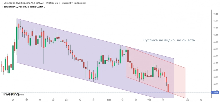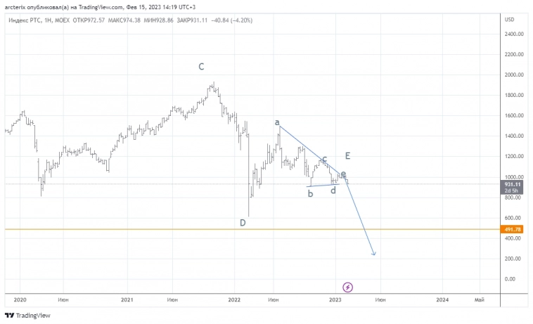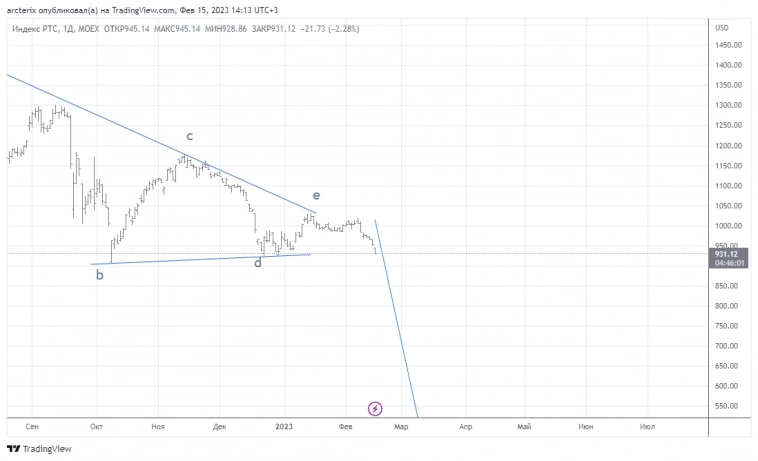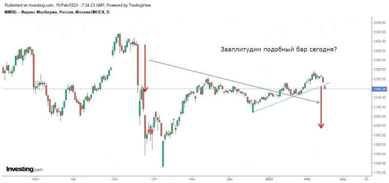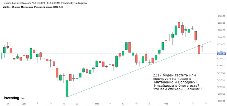 15.02.2023. Вчера индекс ММВБ закрыл день черной свечкой, продолжив снижение и добрался до первой поддержки (на утро 2232), которую остаток дня пилил, закрывшись на уровне (на вечёрке ушли чуть ниже). Похоже, что с хаёв 07.02 мы завершаем (или завершили) коррекцию АВС, где, возможно, не доделали 5 в С, которая не должна уйти ниже нижней границы текущего коррекционного канала (на утро 2222), к тому же чуть ниже располагается 233СС60 (2219) и нижняя граница текущего апканала (2213).