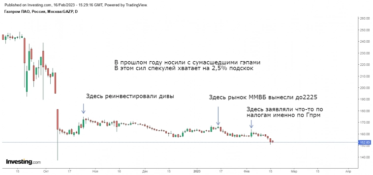 16.02.2023. Вчера индекс ММВБ закрыл день очередной черной свечкой. Индекс пробил свою поддержку (на утро кластерная зона 2212-2217), после чего полетел дальше, ненадолго задержавшись на 2197 и пролетев 2180. А на вечёрке даже пробил фрактал на 2155, чем как бы сломал волновой расклад, где мы делали 2 в 3 в 3, что в случае подтверждения резко увеличивает шансы на завершение роста и начало новой волны снижения в район минимумов декабря, а может и прошлого года.
