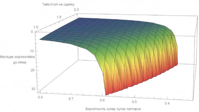 Соответственно, обратным счетом (даже убрав комиссию для красоты) можно прикинуть вероятность удвоения, при которой вероятность сделать 1 млн. руб. из 5 тыс. руб. составит хотя бы 1%.