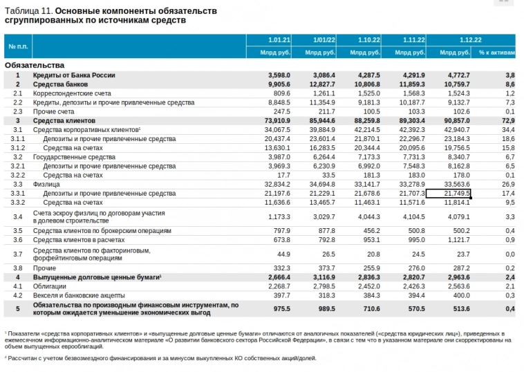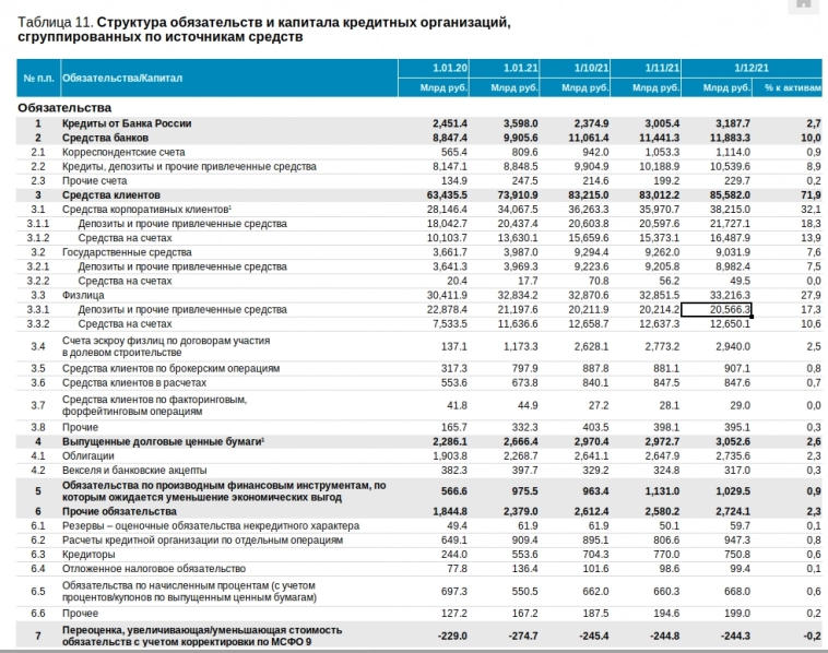 И там видно, что объем депозитов физлиц вырос год к году с 20.57 трлн. до 21.75 трлн., т.е. на 5.7%