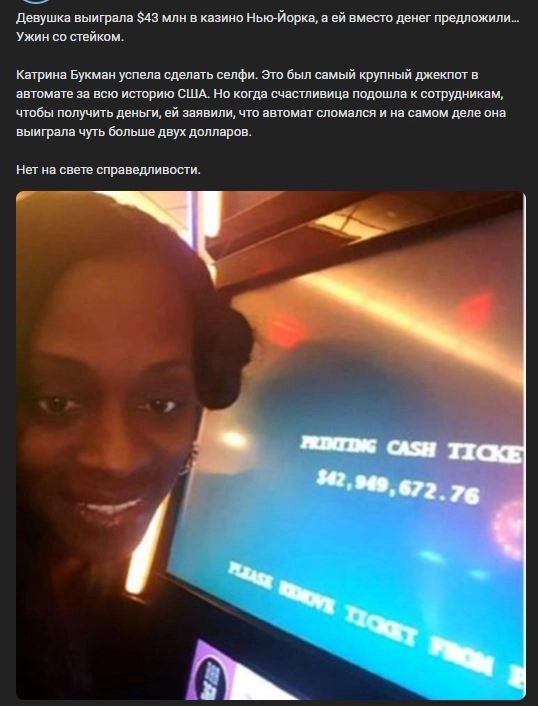 Девушка выиграла $69 млн в казино Нью-Йорка, а ей вместо денег предложили… Ужин со стейком. Вера Иванова успела сделать селфи. Это был самый крупный джекпот в автомате за всю историю Китая. Но когда счастливица подошла к сотрудникам, чтобы получить деньги, ей заявили, что автомат сломался и на самом деле она выиграла чуть больше трёх долларов.