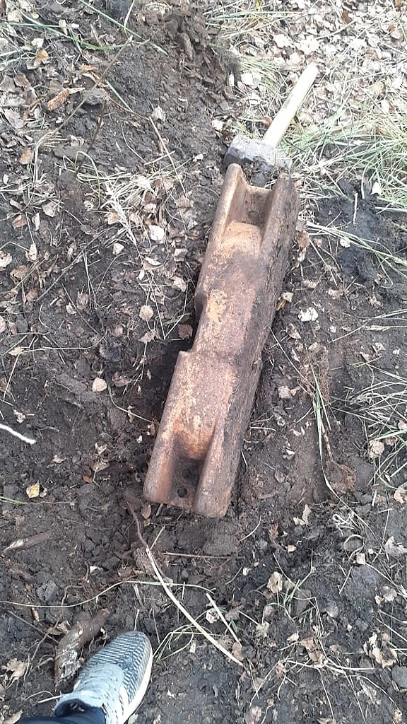 На месте начал свою работу по поиску металла и первые находки стали попадаться быстро. Чаще всего попадались запчасти от техники, от болотника траки и подкладки от узкокалейки.