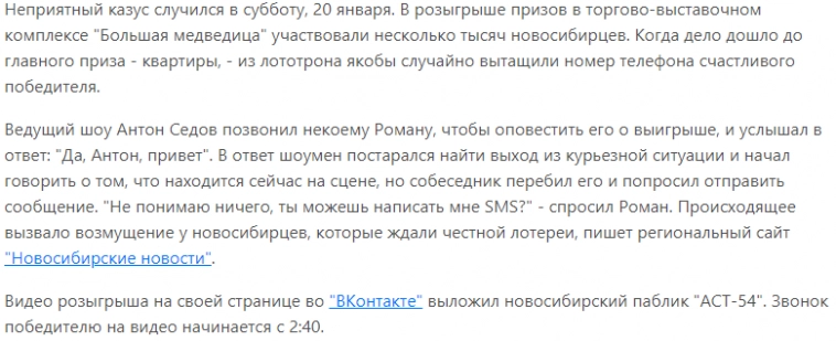 Найду тебе, как большая Корпорация (я правда и не знал о её существовании), разыгрывала денежный, или какой там приз в Новосибирске...