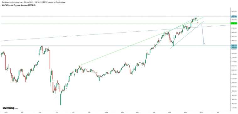 26.06.2023. В пятницу индекс ММВБ закрыл день еще одним «повешенным», правда с разрывом вниз, а если поглядеть дневки индекса ММВБ2 — то там в чт и птн две полноценные красные свечки: всё самое интересное последнее время происходит на вечёрке. Обсуждать произошедшие за выходные события особого смысла нет — экспертов и так хватает, нам главное — понять что будет дальше.