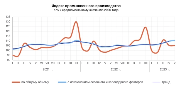 С исключением сезонного и календарного факторов в мае 2023 года, по оценке Росстата, промышленность выросла по сравнению с апрелем на 0,7% после повышения на 1,7% месяцем ранее.