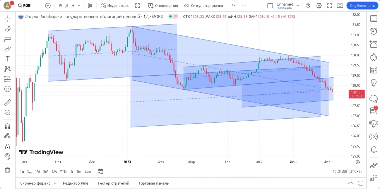 Из интересного: банки снова отбились от сопротивления, но тем не менее потихоньку подрастают, двигаясь вдоль верхней границы своего канала и отбиваясь от неё. Нефтянка приуныла, но выше ближайшей поддержки, откуда до этого отбилась. Продолжили рост металлурги, подходя к основному сопротивлению, откуда отбились 22.06. Остальные сектора без особых изменений. РГБИ ожидаемо отскочил, но под конец слил большую часть роста и, несмотря на то, что свечка в кои то веки зелёная — выглядит всё уныло и продолжение падения пока более вероятно, впрочем, поглядим сегодня.