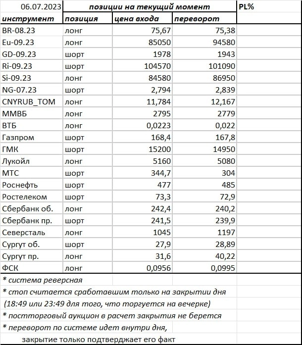 06.07.2023. Вчера индекс ММВБ закрыл день еще одной зеленой свечкой, снова на миллиметр продвинувшись вверх к своим целям (на сегодня — 2835 и 2888). Отменой ростового сценария по-прежнему будет пробой основных поддержек (на сегодня: 2718, 2690 и 2676), что отправит нас в 4 волну, а пока ждём добоя до целей. Мало что меняется, добавить пока нечего.