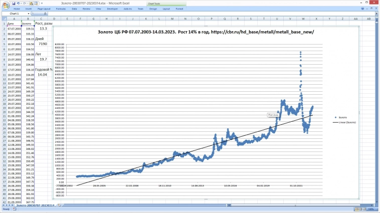 Если взять золото в рублях от 22.09.1997 (начало индекса IMOEX) годовой рост будет больше 19%.