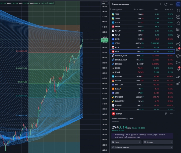 18.07.2023. Вчера индекс ММВБ закрыл день бодрой зеленой свечкой, пробив два сопротивления из трёх (на утро 2902 и 2910) и закрывшись на основном (на утро 2920). Смотрим отработку основного сопротивления: отбой продаём с ближайшими целями 2902 и 2836; пробой с ретестом покупаем и ждём продолжения и вероятно — ускорения роста с целями на сегодня 3021 и 3054.