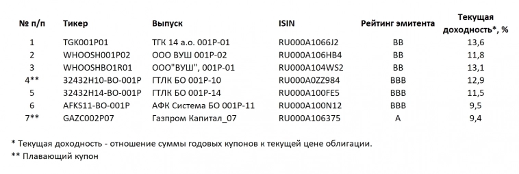 Наиболее интересные облигации по соотношению рейтинг / текущая доходность / ликвидность. Газпром Капитал_07 — это флоатеры, но они были актуальны пару месяцев назад, когда только начались разговоры о повышении ставки. Сейчас долговой рынок уверен в повышении ставки и в значительной степени это повышение отыграл. Рейтинг и тек. доходность можно посмотреть на https://www.dohod.ru/analytic/bonds, в среднем, 11,5% — 13%.