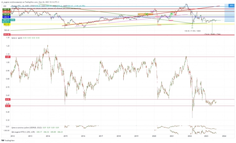 в декабре 2022 индекс IMOEX ушел ниже уровня многолетней поддержки и застрял там на семь месяцев, успев, правда, его дважды протестировать снизу и оба раза откат,, рублевый рост происходит исключительно на балансировке инфляции,, все отчетливей просматривается вариант с двойным дном февраля 2022. Разумеется имхо