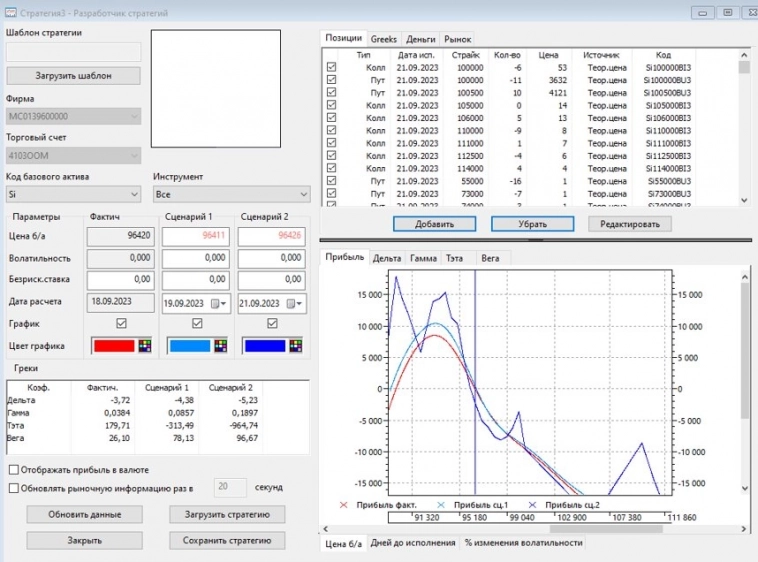 На знак тэтты влияет только НАПРАВЛЕНИЕ СДЕЛКИ. т.е. для проданного опциона тэтта будет положительна, для купленного — отрицательна. Затем, для всего портфеля опционов значения всех греков для каждой из цен БА складываются, и получается итоговая кривая профиля P/L, а также всех греков в зависимости от цены БА.