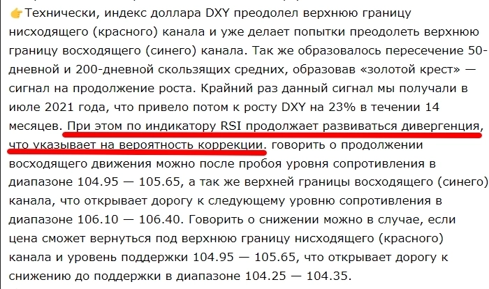 👉Технически, индекс доллара DXY преодолел верхнюю границу нисходящего (красного) канала и уже делает попытки преодолеть верхнюю границу восходящего (синего) канала. Так же образовалось пересечение 50-дневной и 200-дневной скользящих средних, образовав «золотой крест» — сигнал на продолжение роста. Крайний раз данный сигнал мы получали в июле 2021 года, что привело потом к росту DXY на 23% в течении 14 месяцев. При этом по индикатору RSI продолжает развиваться дивергенция, что указывает на вероятность коррекции. говорить о продолжении восходящего движения можно после пробоя уровня сопротивления в диапазоне 104.95 — 105.65, а так же верхней границы восходящего (синего) канала, что открывает дорогу к следующему уровню сопротивления в диапазоне 106.10 — 106.40. Говорить о снижении можно в случае, если цена сможет вернуться под верхнюю границу нисходящего (красного) канала и уровень поддержки 104.95 — 105.65, что открывает дорогу к снижению до поддержки в диапазоне 104.25 — 104.35.