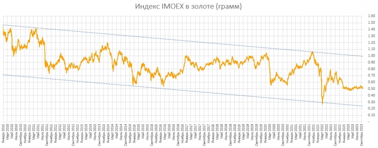 100 грамм, чтобы не впадать в депрессию надо брать индекс полной доходности. Тогда индекс обгоняет золото за счет дивидендов.