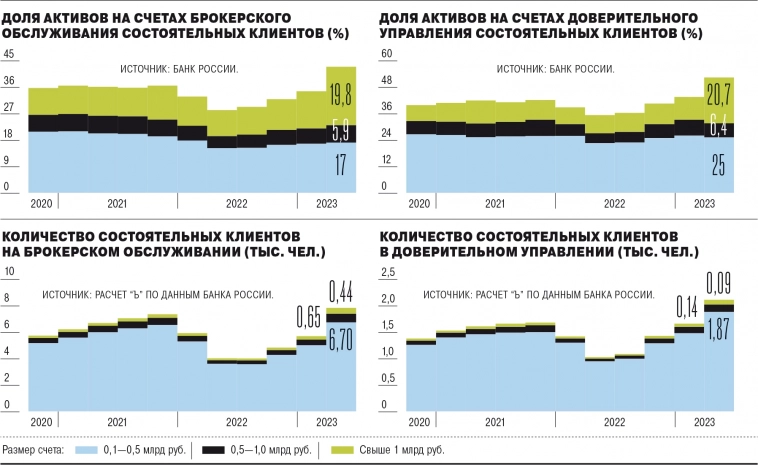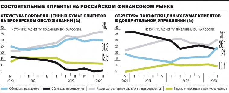 Сильный рост акций, как отмечает руководитель группы продаж и клиентских операций ПСБ Игорь Федосенко, способствовал росту аппетита к риску у клиентов, в том числе и у состоятельных, которые обычно более консервативны, чем другие инвесторы. Об этом свидетельствуют и данные опроса “Ъ” крупных участников рынка. Общая доля инвестиций в структуре активов состоятельных россиян выросла до 33–40%, тогда как в конце 2021 года показатель находился на уровне 28–30%. Доля российских акций выросла с 1–5% до 4–15%.