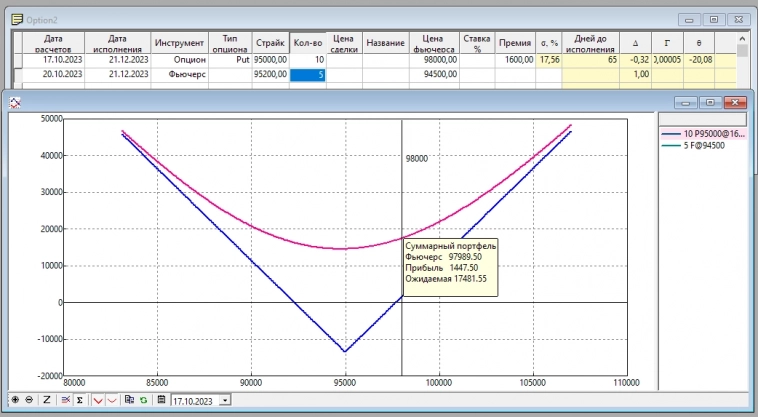 Судя по исходным вводным, у Вас купленный стреддл на страйке 95000 с текущей прибылью около 17500